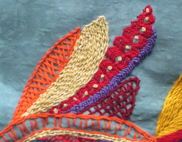 I thought about what shape I would use and thought a fish might work well. I drew the outline on some green material and then reminded myself of the line stitches I knew so I could fill in the shape of the fish. I decided to make it a bright and cheerful fish using bright colours.